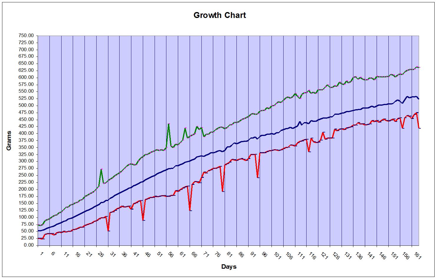 Following is a graph of the weights for 91 kits from birth to 4 months old. The pink and blue line is the highest weight recorded for that day. The blue and red line indicates the lowest recorded weight. The line in the center is the average weight of all 91 kits. The spikes represent dates that have a value outside of the normal range.
